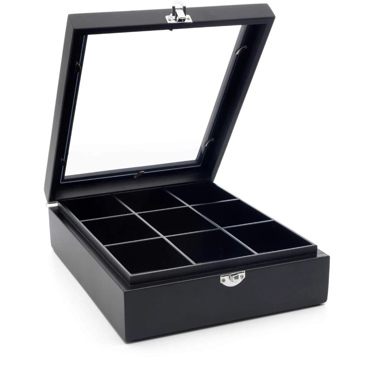 De theedoos van Bredemeijer is gemaakt van zwart gekleurd hout en voorzien van een glazen venster in het deksel. De kist heeft een afmeting van 28 x 22 x 7 cm (l x b x h). De kist heeft 9 vakken voor het opbergen van theezakjes.