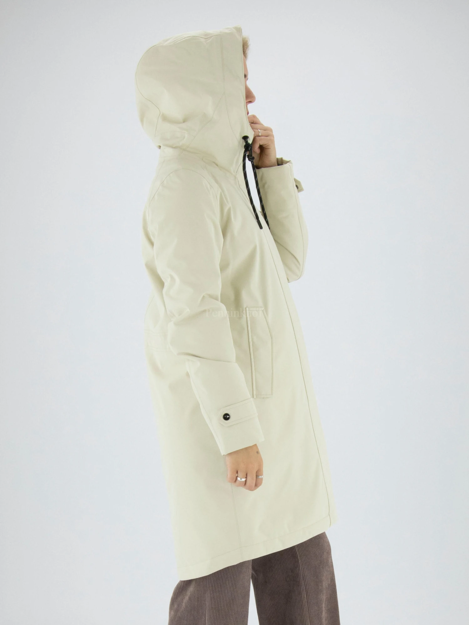 Een coat van Fuchs Schmitt in een kit kleur. De coat heeft een capuchon en een ritssluiting. In het uiteinde van de lange mouwen zijn zwarte manchetten. De coat heeft steekzakken en mag op 30 graden worden gewassen.